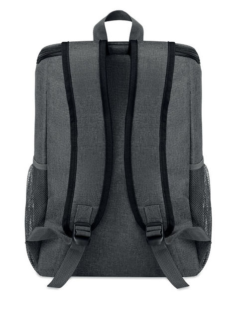 Melírozott színű, 600D RPET anyagból készült hűtő- vagy szabadtéri piknik táska, kétszemélyes készlettel. Rozsdamentes acél kést,PP kompozit villát, kanalat és poharat tartalmaz.