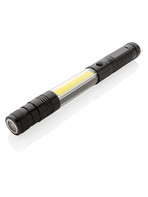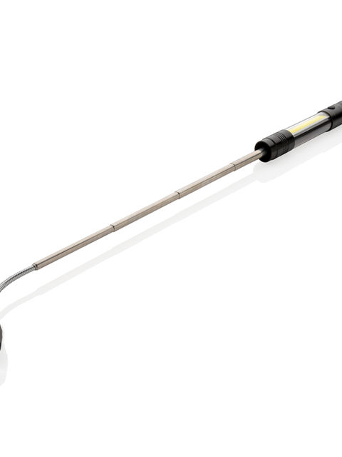 Tökéletes munkatárs ez a dupla mágneses LED lámpa alumíniumból. 26 cm-es méretéről 64 cm-re bővíthető ezáltal szűk, nehezen hozzáférhető helyek is jól megvilágíthatóak. A végén lévő mágnessel az itt lévő kisebb fém tárgyakat is kiemelheti. 3 LED-del at erősebb fény érdekében valamint 80 lumenes COB lámpával. Kinyújtott állapotban a lámpa feje rugalmassá válik és bármelyik irányba elfordítható. Az elem tartozéka a terméknek.