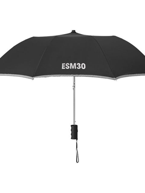 21 colos, 2 szakaszos összecsukható, automata esernyő 190T nyersselyem anyagból. Galvanizált acél nyél, váz és csúcsok. Fényvisszaverő díszítés a paneleken. Fekete műanyag markolat csuklópánttal. Hozzáillő tokban. Manuális záródás.