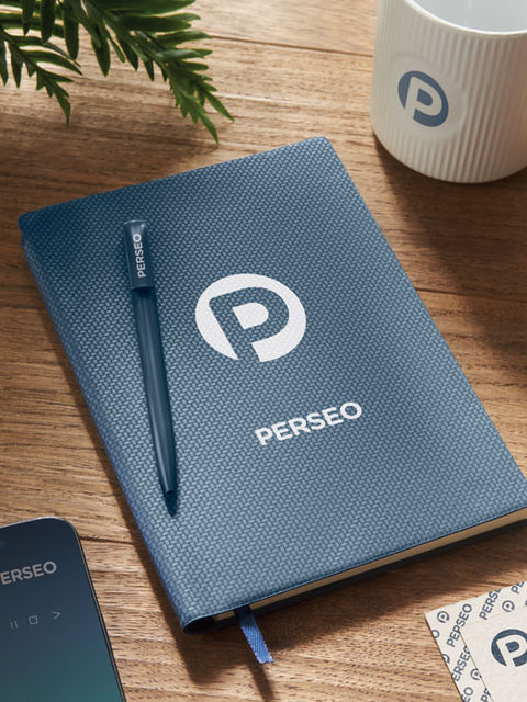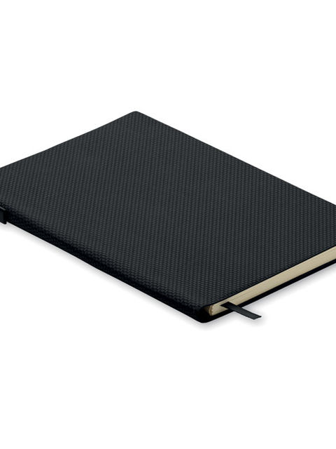 A5 jegyzetfüzet strukturált felületű PU borítóval, a gerincénél kialakított tolltartóban ABS csavarzáras golyóstollal. Cérnafűzött. 160 vonalas oldal (80 lap) újrahasznosított papírból.