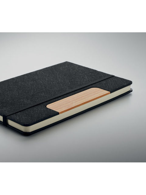 A5 keménytáblás, RPET filc borítós, telefonállvány funkciós jegyzetfüzetből és bambusz tolltestű, nyomógombos golyóstollból álló készlet. Cérnafűzött. 160 vonalas oldal (80 lap) újrahasznosított papírból. Elasztikus zárópánt, könyvjelző szalag. Kéken író betéttel.
