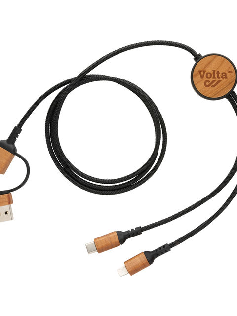 120 cm hosszú, elegáns multikábel tanúsított újrahasznosított anyagokból. 4 különböző csatlakozóval: USB C bemenettel, USB A bemenettel, C típusú kimenettel, iOS kimenettel és micro USB kimenettel. Ez lehetővé teszi a kábel használatát olyan C típusú kimeneti eszközökkel is, amelyek az újabb generációs telefonokhoz és MacBook számítógépekhez tartoznak. A kábel USB A kimeneti bemeneti lehetőséggel is rendelkezik, így bármilyen eszköz bármilyen kimeneti forrásból tölthető. A burkolat és a csatlakozók FSC® cseresznyefából és RCS újrahasznosított poliészter kábelekből (külső anyag) és RCS újrahasznosított TPE-ből (belső anyag) készültek. Teljes újrahasznosított anyag tartalom: 46% a termék összsúlya alapján. Max. kábelhossz: 120 cm. FSC® mix kraft ráhúzható papírgyűrű csomagolásban. PVC-mentes. Töltésre és szinkronizálásra is alkalmas. Max. támogatott áram: 5V/2A.