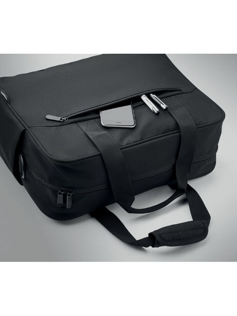 Kézipoggyász utazótáska 600D RPET anyagból, nagy cipzáras elülső zsebbel, két kis oldalzsebbel. 15 colos laptop rekesszel. Párnázott, levehető és állítható vállpánt. Hátoldalán gurulós bőröndre illeszkedő pánttal.