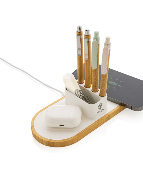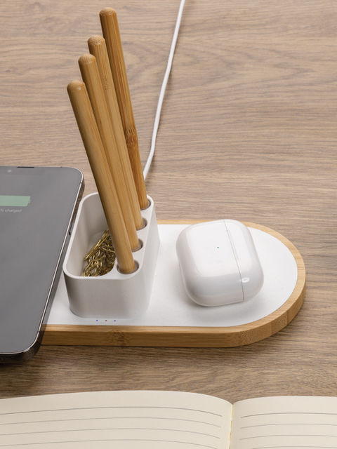 Dupla 10W-os vezeték nélküli gyorstöltő RCS (Recycled Claim Standard) újrahasznosított ABS-ből, tolltartóval. Teljes újrahasznosított anyag tartalom: 31% a termék összsúlya alapján. Az RCS-tanúsítvány biztosítja az újrahasznosított anyagok ellátási láncát. Az alap FSC® 100% bambuszból készül. A vezeték nélküli töltő az Android legújabb generációival, iPhone 8 és újabb verziókkal kompatibilis. Egyszerre két telefont vagy bármely más vezeték nélküli eszközt tölthet. 4 toll-lyukkal a ceruzák tárolására és kis tárolóhellyel névjegykártyáknak vagy egyéb apró tárgyaknak. A termék és összetevői PVC-mentesek. 120 cm-es C típusú töltőkábellel RCS újrahasznosított TPE-ből. FSC® mix kraft dobozban. C típusú bemenet; Bemenete 5V/2A; 9V/2A; Vezeték nélküli kimenete 5V/1A; 9V/1,1A; (10 W) Bejegyzett dizájn®