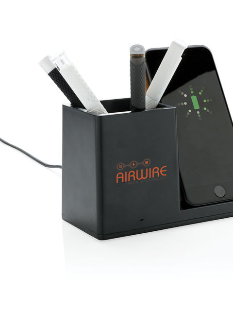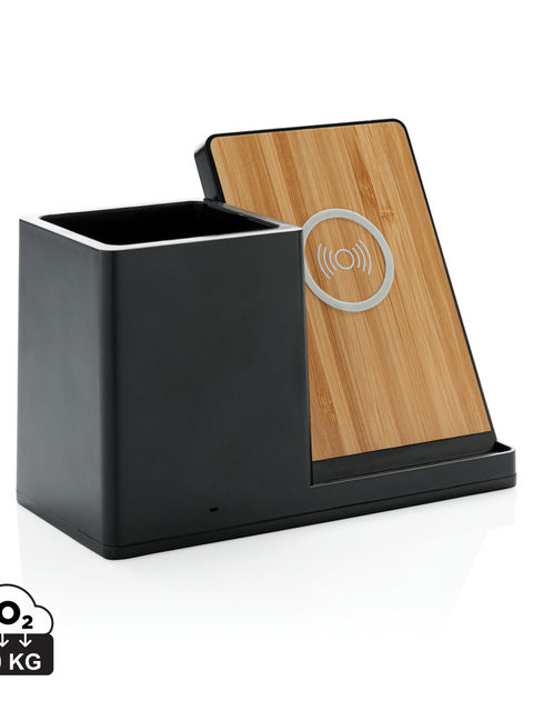 RCS (Recycled Claim Standard) újrahasznosított ABS-ből készült 10W-os vezeték nélküli gyorstöltő tolltartóval. Teljes újrahasznosított anyag tartalom: 78% a termék összsúlya alapján. Az RCS-tanúsítvány biztosítja az újrahasznosított anyagok ellátási láncát. Bambusz vezeték nélküli töltési felület FSC 100 bambuszból. Két USB csatlakozóval a hátoldalán a kábelen keresztüli töltéshez. A vezeték nélküli töltés az Android legújabb generációival, iPhone 8 és újabb verziókkal kompatibilis. A termék és tartozékai PVC-mentesek. RCS újrahasznosított TPE-ből készült 120 cm-es C típusú töltőkábellel. FSC mix kraftdobozban. C típusú bemenet; Bemenet 5V/2A; 9V/2A; Vezeték nélküli kimenet 5V/1A; 9V/1,1A; (10 W) Bejegyzett dizájn®