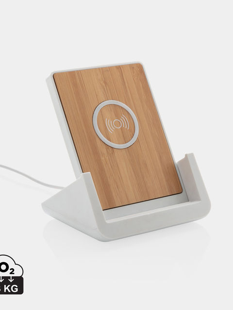 RCS (Recycled Claim Standard) újrahasznosított ABS-ből készült 10W-os vezeték nélküli töltő. Teljes újrahasznosított anyag tartalom: 47% a termék összsúlya alapján. Az RCS-tanúsítvány biztosítja az újrahasznosított anyagok ellátási láncát. Bambusz vezeték nélküli töltési felület FSC 100 bambuszból. Két USB csatlakozóval a hátoldalán a kábellel történő töltéshez. Az állványt arra tervezték, hogy a telefont vízszintes és függőleges helyzetben egyaránt töltse. A vezeték nélküli töltés az Android legújabb generációival, iPhone 8 és újabb verziókkal kompatibilis. At ermék és tartozékai PVC-mentesek. RCS újrahasznosított TPE-ből készült 120 cm-es C típusú töltőkábellel. FSC mix kraft dobozban. C típusú bemenet; Bemenet 5V/2A; 9V/2A; Vezeték nélküli kimenet 5V/1A; 9V/1,1A; (10 W) Bejegyzett dizájn®