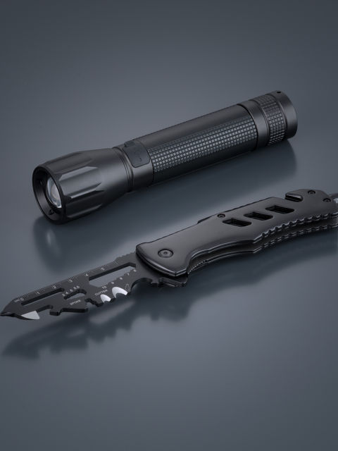 Egy kompakt és tartós multifunkciós szerszám vágókéssel, vonalz óval, övvágóval, pillangókulccsal, imbuszkulcsokkal (4–10 mm), üvegtörővel és konzervnyitóval egyesíti az alapvető eszközöket könnyű kialakításban. A nagy teljesítményű zseblámpa masszív alumíniumházzal, IP64 vízállósággal, állítható zoomos fénynyalábbal (akár 200 m) és öt világítási móddal rendelkezik.
