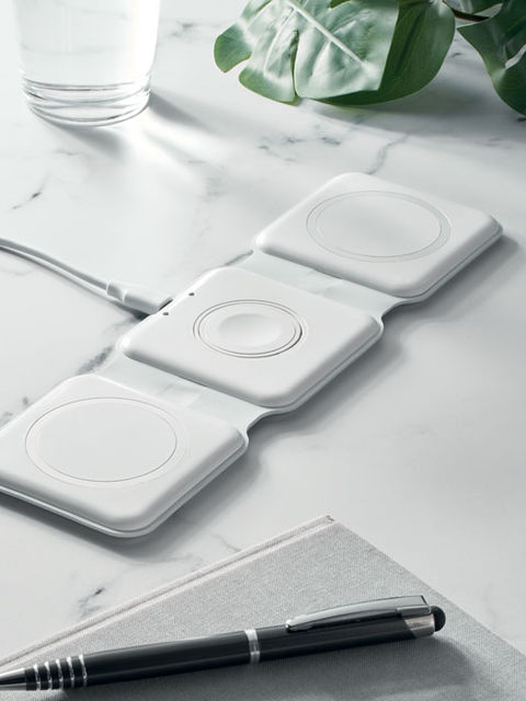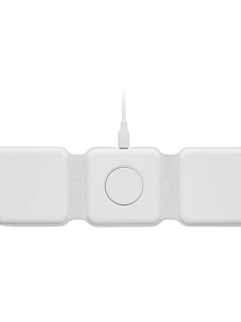 3 az 1-ben összecsukható töltőállomás ABS-ből. 3 vezet ék nélküli töltési ponttal rendelkezik. Bemenet: 2 az 1-ben C-típusú és USB-A. Összteljesítmény: 15W.