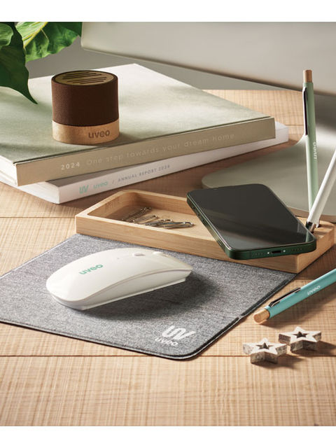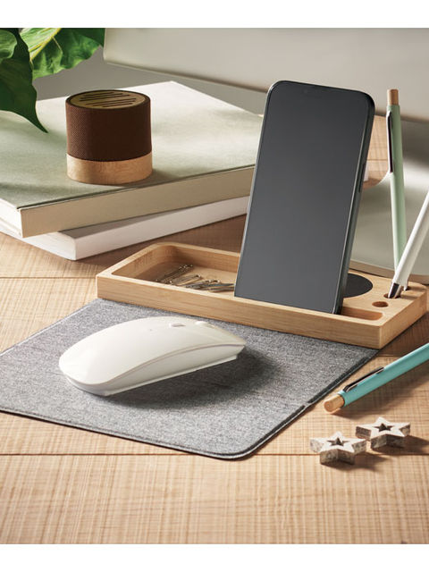 Vezeték nélküli töltő és asztali rendszerező bambuszból, telefonállvánnyal, 3 tolltartóval és összehajtható RPET egérpaddal. Teljesítmény: DC 9V/1.67A (15W).