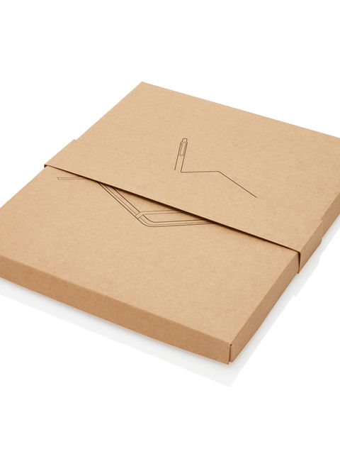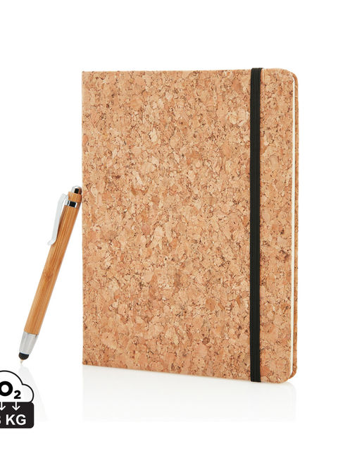 Természetes parafából készült ECO jegyzetfüzet 160 oldallal (80 g). Fekete könyvjelzővel és gumiszalaggal. Tartalmazza a bambusz érintőtollat golyóstollal és érintőrésszel.