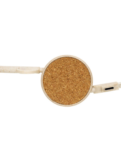 Egyedi kialakítású visszahúzható kábel minden készülék feltöltéséhez, minden USB forráshoz. Parafából és búzaszárból (35%) ABS anyaggal keverve valamint PVC-mentes TPE kábellel. A C-típusú bemenet által kompatibilis a legújabb generációs mobiltöltőkkel és macbook computerekkel amik kizárólag C-típusú kimenettel rendelkeznek. A kábel rendelkezik továbbá egy hagyományos, USB A bemenettel is. Kimenete: C típusú csatlakozóval valamint kétoldalú csatlakozóval: IOS és micro USB-s Android készülékekhez. A kábel hossza max 100 cm. 100%-ban PVC-mentes termék.