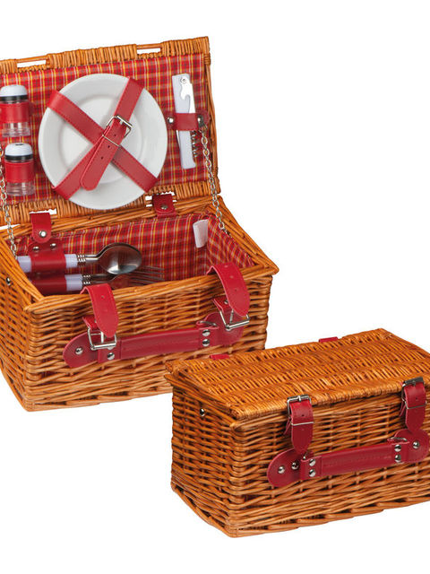 Kétszemélyes kézi piknik kosár. Tartalmaz 6 darabos evőeszközt, pincérkést, só- és bors szórókat, valamint két porcelán tányért.
