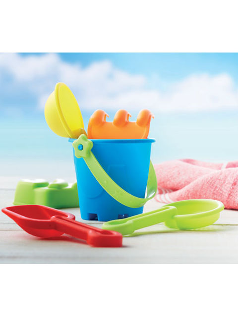 Gyerek homokozó szett. Vödörrel, 2 különböző lapáttal, gereblyével, szitával és hal homokozó formával. Mindegyik rész PP anyagból készült. A szett véletlenszerű színekben érkezik.