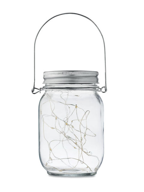 Napelemes befőttesüveg kültéri lámpa 20 LED-es fényfüz érrel. Akasztóval a tetején. Üzemidő kb. 5 óra. 300 mAh nikkel-metálhidrid akkumulátorral. IP44.