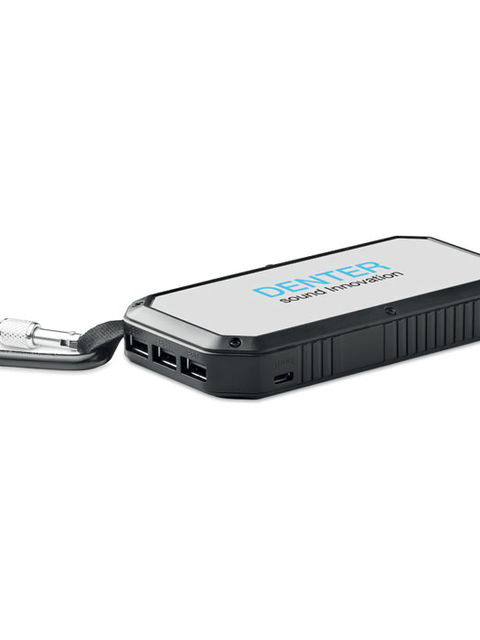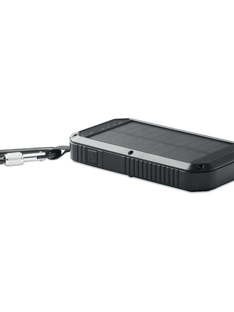 Napelemes 8000 mAh powerbank, lámpa funkcióval. Tartalmaz 21 LED lámpát, USB kábelt mikro usb csatlakozóval és karabinert. Teljesítmény DC5V/1A és DC5V/2A.