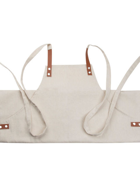 340g-os Oeko-Tex pamutból készült elegáns kötény, két elülső zsebbel és kontrasztos színű PU-ból készült állítható pántokkal.