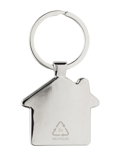 Ház alakú kulcstartó RCS újrahasznosított cinkötvözetből és bambuszból. Teljes újrahasznosított anyagtartalom: 76% a termék összsúlya alapján. Az RCS-tanúsítvány biztosítja az újrahasznosított anyagok ellátási láncát. Papírzacskóban.