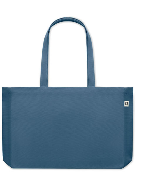 Újrahasznosított vászon bevásárlótáska vagy strandtáska hosszú füllel, oldalsó toldással. 50% pamut és 50% újrahasznosított pamut, 280 g vastag anyag.