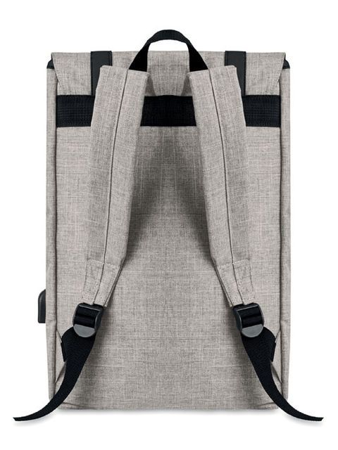 Laptoptartó hátizsák melírozott 600D poliészter anyagból, párnázott vállpántokkal. Egy fő belső rekesz 15 colos laptop számára, beépített USB töltőkábel. Mágnespatentos záródással, elől cipzáras zsebbel.