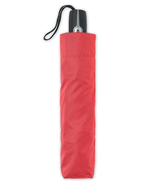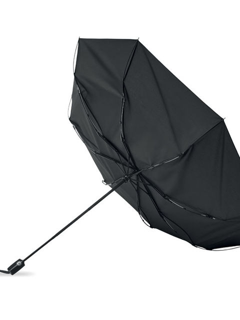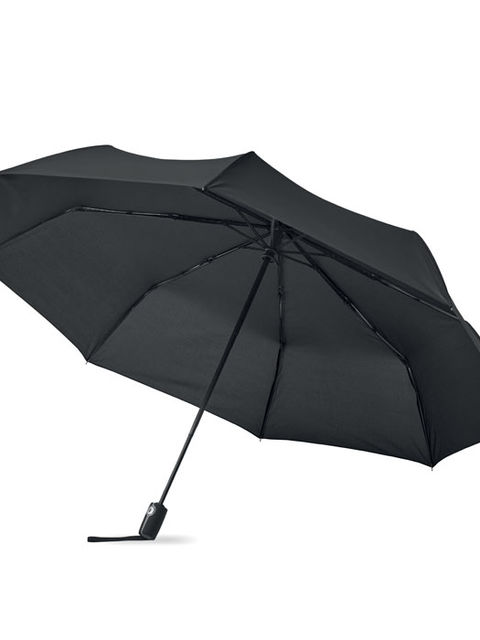27 colos, 3 szakaszos összecsukható, automatikusan nyíló és záródó, szélálló esernyő. 190T nyersselyem anyagból készült, fekete bevonatos acél szárral. Üvegszálas bordák, fekete PP fogantyú nyomógombbal. Hozzáillő tokban.