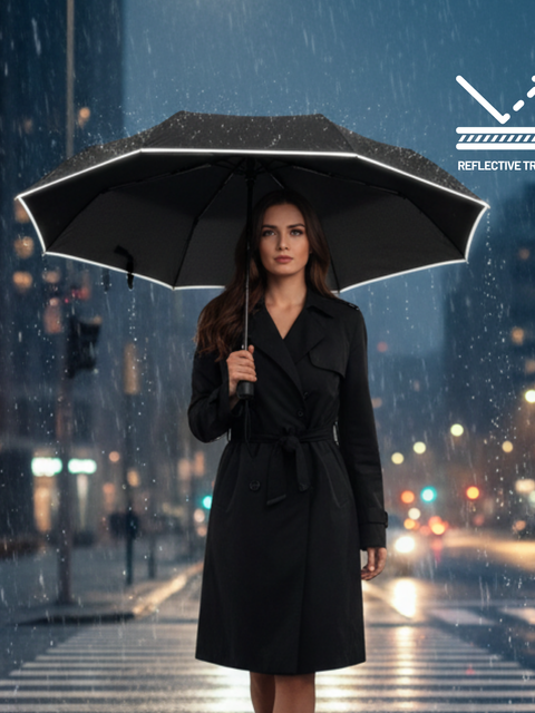 Tartós esernyő 190 pongee anyagból, acél- és üvegszálas vázzal. Fényvisszaverő szegéllyel rendelkezik a kupola mentén a jobb láthatóság érdekében, automatikus nyitó- és zárórendszerrel, valamint szélálló mechanizmussal a megbízható használatért.