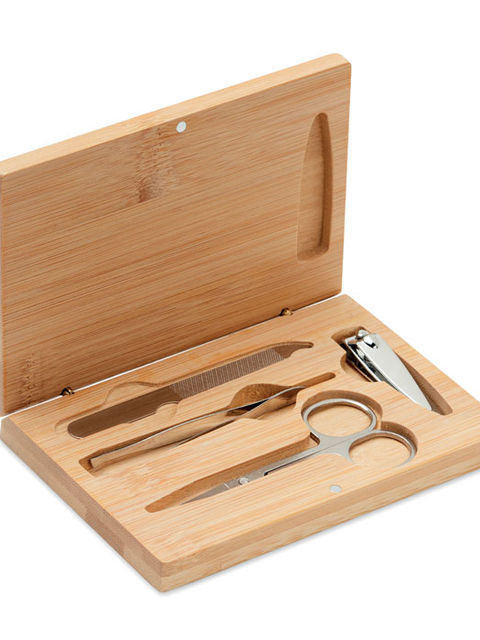 4 részes rozsdamentes acél manikűrkészlet mágneses záród ású bambusz tokban. Tartalmaz ívelt körömvágó ollót, körömcsipeszt, körömreszelőt és szemöldökcsipeszt. A bambusz természetes anyag, színében, mintázatában és méretében esetenként eltérő lehet.