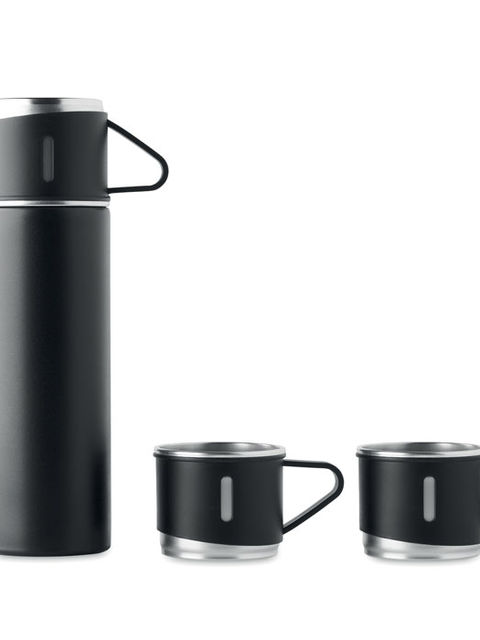Duplafalú rozsdamentes acél termoszpalackból, szivárgásmentes fedélként szolgáló bögréből és 2 további bögréből álló ajándékszett. Űrtartalom: termoszpalack 420 ml, bögrék 150 ml.