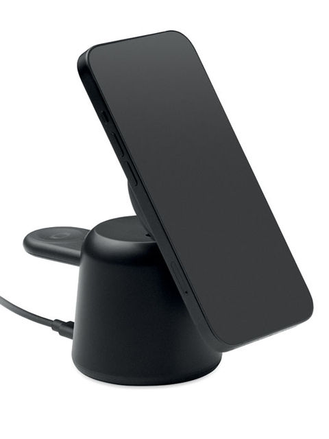 3 az 1-ben töltőállomás ABS-ből. 15 W-os mágneses vezet ék nélküli töltő telefonhoz és TWS-hez, telefontartó funkcióval, valamint okosóra töltő (csak iOS). iPhone® 12 és újabb készülékekkel kompatibilis. További fémgyűrűt tartalmaz a nem mágneses telefonok támogatásához.