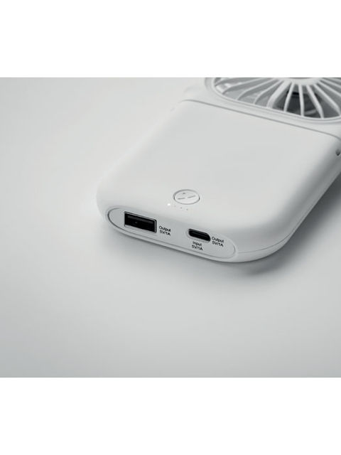 Hordozható, összecsukható ventilátor állítható nyakpánttal. 3 sebességfokozat. Összehajtva asztali ventilátorként is használható. USB porton tölthető 3000 mAh kapacitású külső akkumulátor funkcióval.