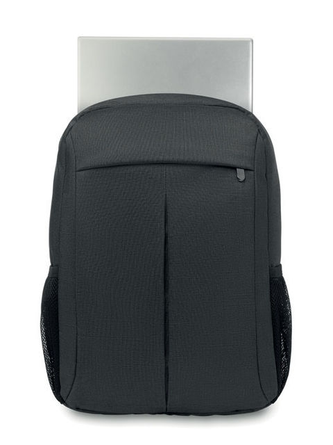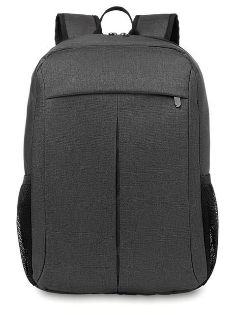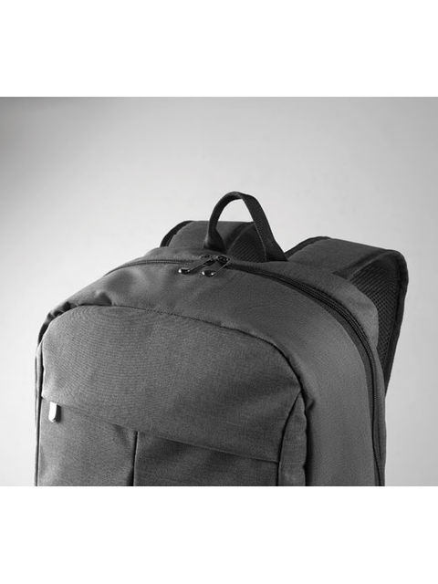 Melírozott színű 360D poliészter laptop hátizsák. Egy f ő rekesszel egy 15 colos laptop számára. Cipzározható elülső zseb. Párnázott hátrész és vállpántok. A hátulján pánttal, mellyel bőröndhöz csatlakoztatható.
