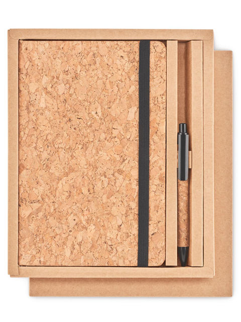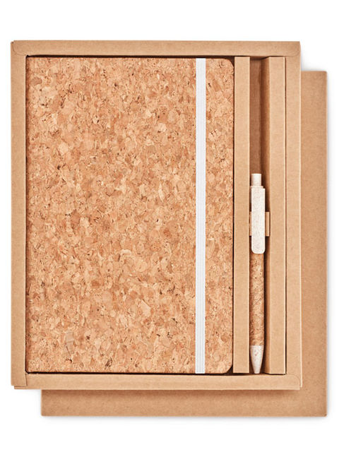 A5 parafa jegyzetfüzet, hozzáillő tollal. Parafa keménytáblás borító. Cérnafűzött. 160 vonalas oldal (80 lap) újrahasznosított papírból. Elasztikus zárópánt és tolltartó hurok. Hozzáillő nyomógombos golyóstoll parafa tolltesttel, 50% búzaszalma és 50% PP anyagból készült szerelvényekkel. Ajándékdobozban. A parafa 100%-ban természetes anyag. Szerkezeti jellege és felületi porozitása miatt az egyes tárgyak végső emblémázási eredménye eltéréseket mutathat.
