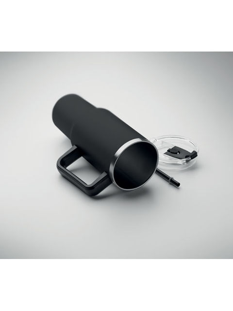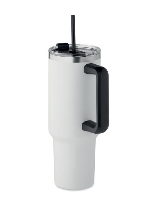 Duplafalú, újrahasznosított rozsdamentes acél pohár, beépített PE- szívószálas fedéllel. Űrtartalom 1200 ml. (90% újrahasznosított rozsdamentes acél és 10% rozsdamentes acél).