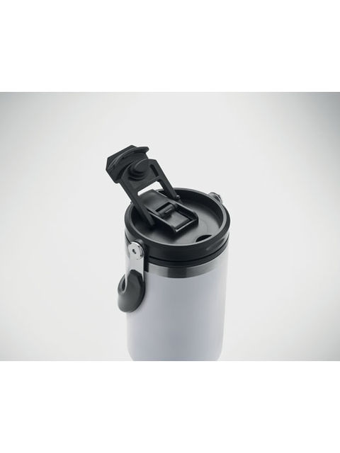 Duplafalú pohár újrahasznosított rozsdamentes acélból (90% újrahasznosított rozsdamentes acél és 10% rozsdamentes acél). Fedél belső szívószállal, kihajtható valamint nyitható ivónyílással. Űrtartalom: 850 ml.
