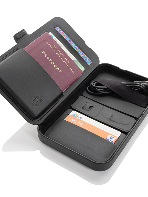 Kemény borítású utazótáska beépített 3 az 1-ben vezeték nélküli töltővel, amely RCS újrahasznosított PU-ból készült. Teljes újrahasznosított anyagtartalom: 5% a termék összsúlya alapján. Az RCS-tanúsítvány biztosítja az újrahasznosított anyagok ellátási láncát. Az utazótáska tárolóhelyet biztosít az útlevélnek, több kártyának, kábeltartóval rendelkezik. Mágneses 15W-os vezeték nélküli töltővel és egy további 5W-os vezeték nélküli töltővel, amely fülhallgató tokokhoz vagy más kisméretű vezeték nélküli tölthető eszközökhöz alkalmas, valamint egy 2,5W-os vezeték nélküli töltővel okosórákhoz (csak Apple órákhoz). Tökéletes az összes értéktárgy szállítására és az összes eszköz töltésére. Belül egy kis mágneses pénztárca is található, amely kivehető. 120 cm-es TPE kábellel. FSC® mix csomagolásban. A termék és tartozékai 100% PVC-mentesek. Minimális bemenet: 9 V/3 A az optimális használathoz. Kimenet: telefon: 9 V/1,1 A; 9 V/1,67 A/(15 W), fülhallgató: 5 V/1 A (5 W), óra: 5 V/0,5 A.