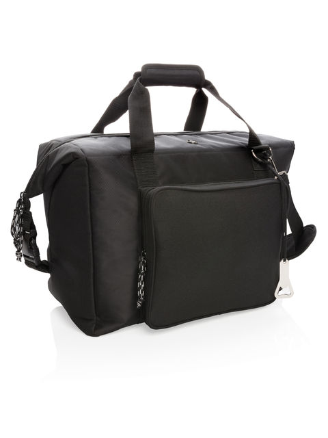1680D és 600D poliészter táska extra nagy cipzáros főrekesszel és ugyancsak cipzáros elülső zsebbel. Könnyen átalakítható hordtáskává a szélén lévő szíjak segítségével. 40 literes tehát akár 10 db 1,5 literes palack is elfér benne. Duplán megerősített fogó, állítható válpánt, PEVA szigetelés. Sörnyitóval érkezik.