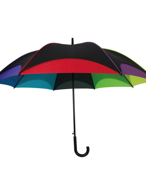 Poliészterből készült XXL méretű automata esernyő szivárvány színben, műanyag fogantyúval, műanyag hegyekkel és fekete vázzal.