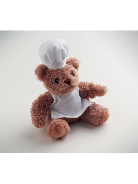 Poliészter plüss mackó szakács ruhában, fehér sapkában és kötényben. Hímzett szemekkel, orral és szájjal.