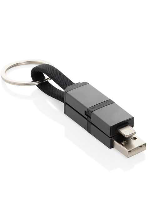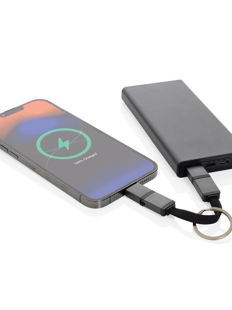 Gyorstöltő 4 az 1-ben kulcstartó kábel RCS újrahasznosított TPE-ből, újrahasznosított alumíniumötvözetből és újrahasznosított PET-ből. Az USB-A és C típusú bemenettel, valamint IOS és C típusú kimenettel sokféle eszköz töltésére alkalmas. Ez a kis méretű kábel támogatja a 60W-os gyorstöltést. A mellékelt kulcstartó gyűrűvel könnyen rögzíthető a kulcstartóhoz. A csatlakozók belsejében mágnesek vannak, hogy együtt tartsák azokat szállítás közben. Teljes újrahasznosított anyagtartalom: 60% a termék összsúlya alapján. Az RCS-tanúsítvány biztosítja az újrahasznosított anyagok ellátási láncát. Max. támogatott áram 20 V/3 A; Műanyagmentes borítékcsomagolásban. PVC-mentes.