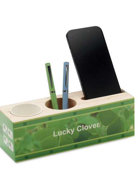 Fából készült íróasztali állvány toll- és telefontartóval, valamint lóheremagokkal. Csempésszen egy kis életet és zöldet irodájába vagy otthonába ezzel a vidám íróasztal- vagy asztali dekorációval. Ültesse el a magokat, és lóherék fognak kinőni. Az is lehez, hogy meglepik néhány szerencsehozó négylevelű lóherével. A fa természetes anyag, termékenként szín- és méretbeli eltérések jelentkezhetnek, ami befolyásolhatja a dekoráció végső eredményét. Ültetőközeg koronggal szállítjuk. FSC®-certified | FSC 100%, W13.2, FSC-C213206