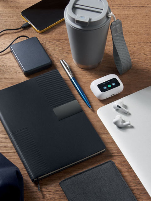 A5 jegyzetfüzet PU puhafedeles borítóval. Cérnafűzött. 160 vonalas oldal (80 lap), újrahasznosított papírból. Illeszkedő színű elasztikus zárópánt és könyvjelző szalag. Fém részlet az elülső oldalon.