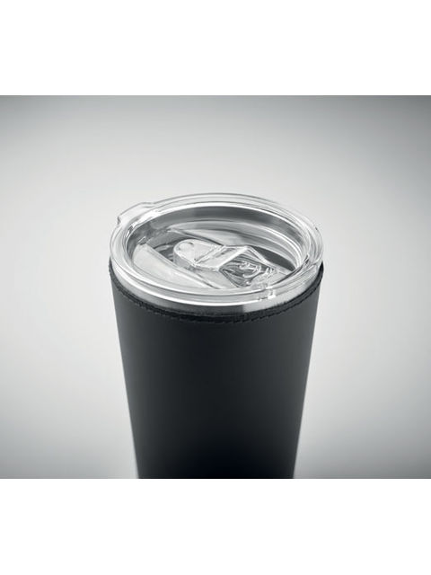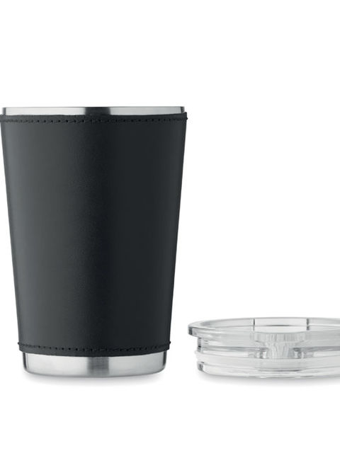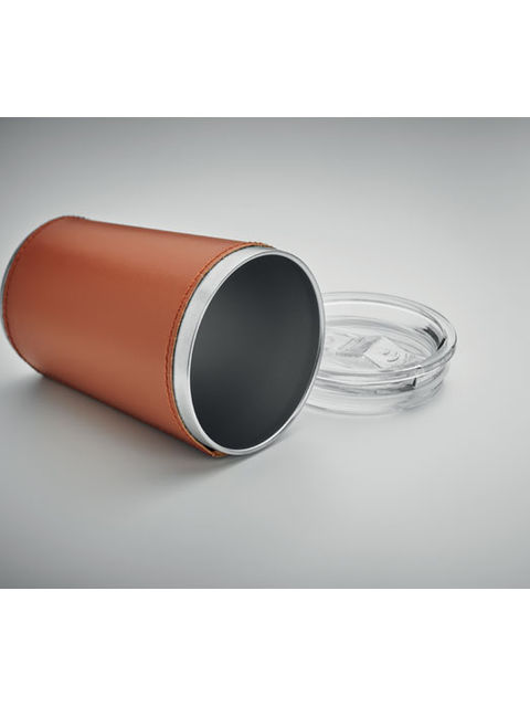 Duplafalú pohár újrahasznosított rozsdamentes acélból (90% újrahasznosított rozsdamentes acél és 10% rozsdamentes acél), levehető PU bőr tokkal. Fedél csúsztatható ivónyílással. Szivárgásmentes. Űrtartalom: 350 ml.
