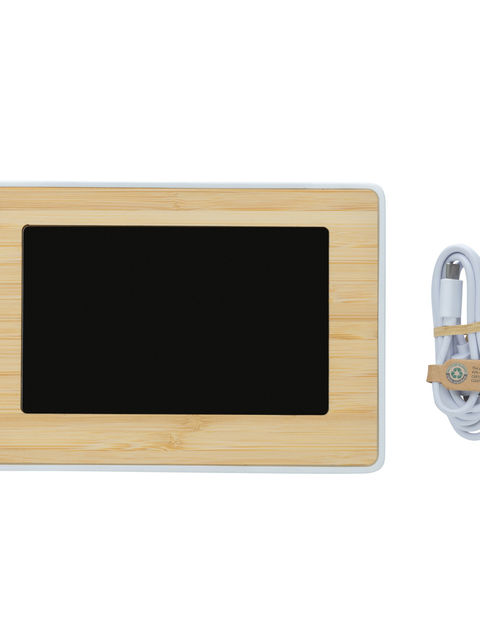 RCS (Recycled Claim Standard) újrahasznosított ABS-ből és FSC® 100% bambuszból készült nagy időjárásjelző állomás. Teljes újrahasznosított anyag tartalom: 76% a termék összsúlya alapján. Az RCS-tanúsítvány biztosítja az újrahasznosított anyagok ellátási láncát. Kiváló minőségű LED kijelzővel. Funkciók: óra, ébresztő, hőmérséklet, 12/24 órás opció. RCS újrahasznosított TPE-ből készült 100 cm-es C típusú töltőkábellel. FSC® mix kraft dobozban.