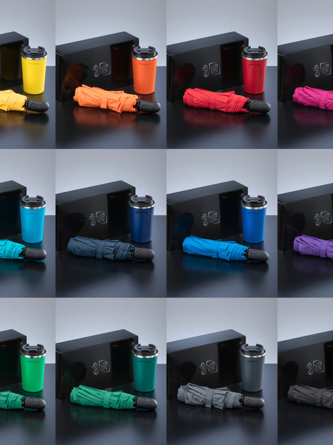 Praktikus készlet az úton lévők számára. Egy teljesen automatikus összecsukható esernyő és egy kiváló szigetelő tulajdonságú termöbögre. Számos színben kaphat ó. Nagy fehér díszdobozba csomagolva.