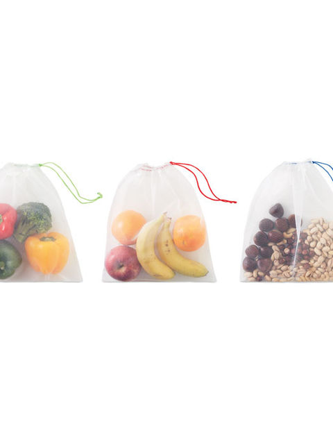 3 RPET bevásárlótasak, RPET tokban. Többször használható, bevásárlásnál kiváltja az eldobható műanyag zacskókat. Húzózsinóros záródással. Mosógépben mosható, BPA mentes, élelmiszer tárolására biztonságosan használható.