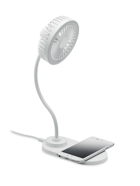 10W-os asztali vezeték nélküli töltő ventilátorral és 80 lumenes LED lámpával, ABS-ből. Ventilátor 3 sebességfokozattal. Teljesítmény: DC 9V/1,1A (10W) a gyorstöltéshez. Qi készülékekhez.