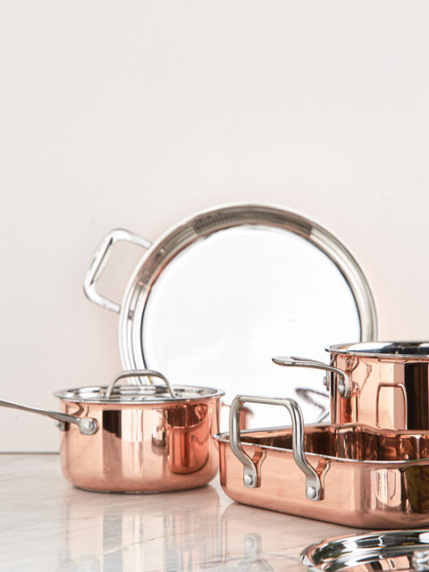 Exkluzív háromrétegű réz fazék. Az első réteg a réz külső, a belső pedig egy alumíniumrétegből és egy rozsdamentes acélrétegből áll amelyek megkönnyítik a tisztítást. A réz- és alumíniumréteg jól vezeti a hőt így az edény gyorsan és egyenletesen melegszik fel. Az alja vastagabb rozsdamentes acéllemezzel erősített az indukciós főzőlapon való használathoz. Rozsdamentes acél fogantyúi hűvösebbek maradnak főzés közben. Minden típusú tűzhelyhez alkalmas, beleértve az indukciósat is.