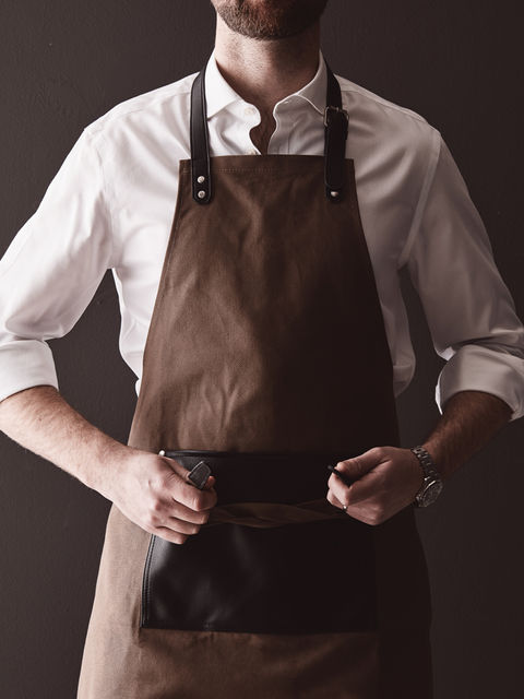 Stílusos és klasszikus kötény vastag pamutvászonból, diszkrét PU alkotóelemekkel. Állítható csattal a tetején és nagy zsebbel az elején. Hosszú élettartamú kötény ami idővel csak szebb lesz.