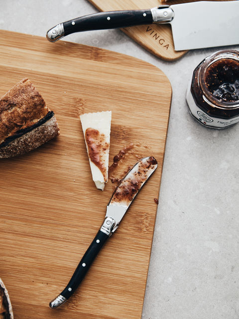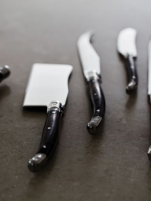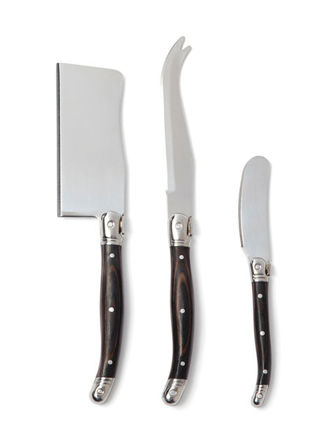Exkluzív, rozsdamentes acél sajtvágó késkészlet amely k ét sajtvágó késből és egy fekete pakkafa markolattal ellátott vajvágó késből áll. Exkluzív ajándékdobozban.