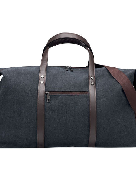 Hétvégi táska kiváló minőségű, 450 g. vastag koptatott vászonból, újrahasznosított PU részletekkel. 210D RPET bélésanyaggal, erős, állítható és levehető pántokkal. Tökéletes kézipoggyász méret.