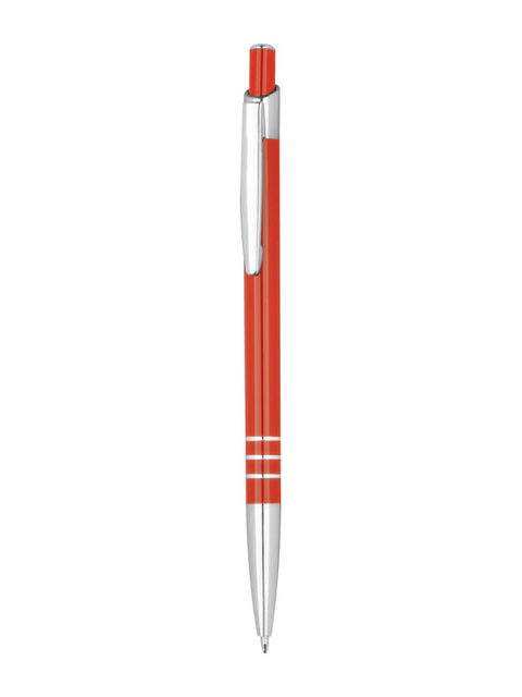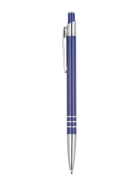Karcsú kialakítású golyóstoll újrahasznosított alumíniumból, kék színű tollbetéttel és három díszítőgyűrűvel.